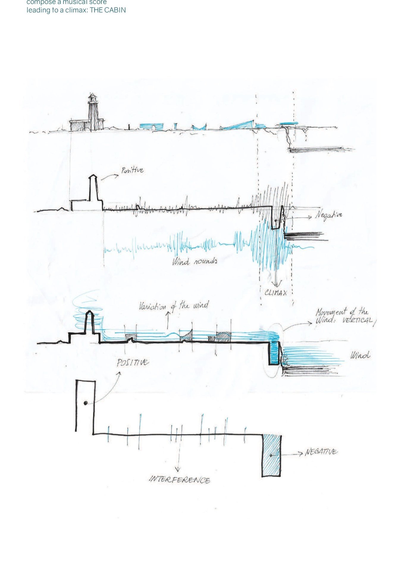 The intervention is conceived to amplify attention towards the intangible yet potent force of wind, which, though unseen, exerts a profound influence on the area's ambiance over time. Embracing the wind as a central protagonist, our design orchestrates a symphonic narrative, where the wind's ethereal movements interact with an array of carefully crafted elements. These elements, varying in shape, size, and orientation, are strategically positioned along a path, guiding the wind's flow to culminate in a climactic convergence. This culmination serves as a poignant counterpoint to the imposing presence of the existing lighthouse, offering a transformative experience through the interplay of contrasts. As the journey progresses towards its zenith at "the cabin," the narrative expands to encompass a rich tapestry of natural phenomena. Here, the elemental forces of nature intertwine with the architectural form, producing captivating effects such as geyser eruptions when sea water collides with the cliff face. In this intricate dance between the built environment and the natural world, our intervention seeks not only to amplify the sensory experience but also to deepen our connection with the sublime forces that shape our surroundings.