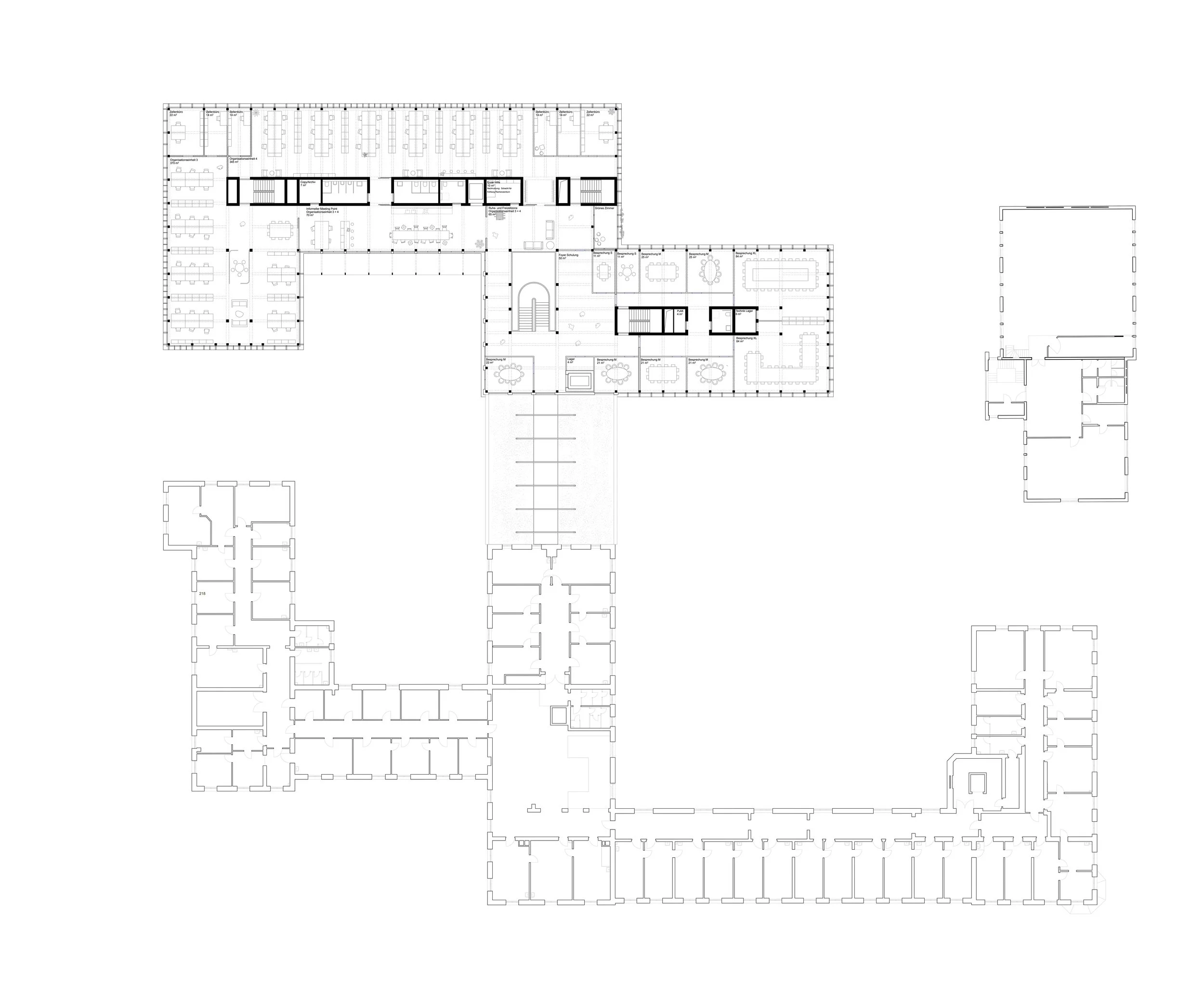 At the heart of the project lies a newly defined basement-level entrance, conceived as a prestigious and fully barrier-free double-entry route that unifies former and future access paths into a coherent arrival sequence. Above, an elevated entrance hall, designed as a pavilion between existing and new buildings, forms the central hub for orientation and administrative exchange.
