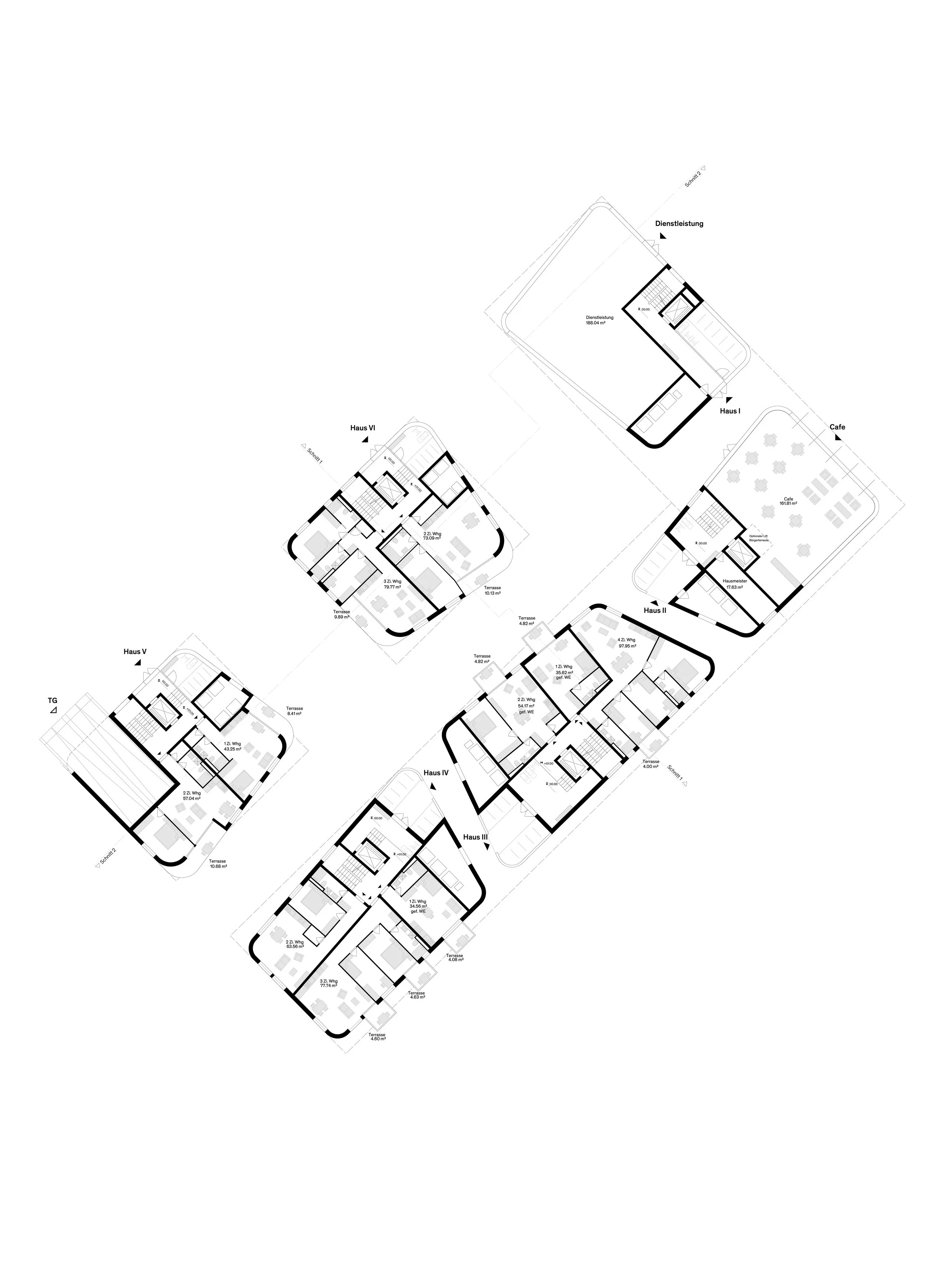 A forward-looking urban development mediates between the neighboring detached houses on Tullastrasse and multi-storey residential buildings on Hermann-Quack-Strasse. A lively square with shops and a café in the north-west gives the development an urban feel. The loose, flowing proportions of the buildings with soft edges and the intuitive passageways provide an inviting setting for living in urban greenery for all generations. The new complex mediates between the districts and forms a place of encounter and exchange. Two cross-connections and a longitudinal axis make the path through the new development permeable to the surrounding neighborhoods. The linking of the surrounding uses is thus stimulated and enhanced. All apartments can be accessed barrier-free and are equally age-appropriate and family-friendly. The living space interweaves with the exterior design, whose formal language is based on the soft lines of the buildings. The material and design language become an identity-forming element and ensure that the sustainable residential complex has a supra-regional appeal. Formal accents such as rounded corners in the transition between the volumes create a link between the living space and the softly designed landscape.